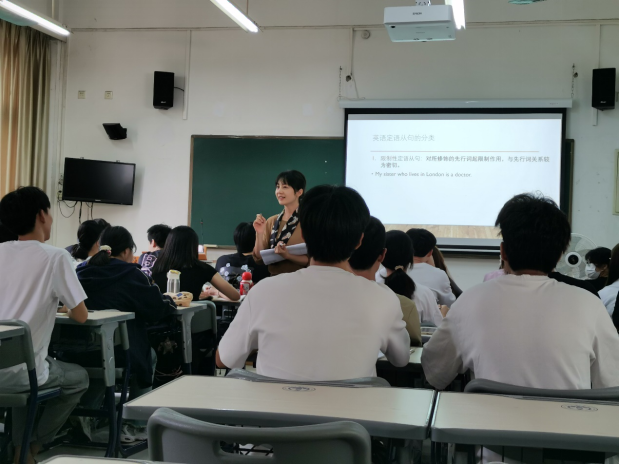 公开课内容充实,共分为三个部分:学生小组展示、作业点评、新知识点讲解。学生小组展示以《肖申克的救赎》的电影片段为例,讲述字幕英译汉的原则和技巧,结构清晰,重点突出,现场效果良好。展示结束后,刘芳老师表扬了该组同学的精彩表现,并就其中的典型案例进行进一步的阐发,提示学生台词翻译要贴合人物形象和语境,并建议同学们通过增加剧照等细节进一步提升展示质量。在作业点评环节,刘芳老师先是检查了学生上节课后被动语态练习完成情况,然后邀请部分同学朗读原文并分享译文,分析和总结翻译方法。在本堂课的新知识点讲解环节,刘芳老师带领学生通过定义和分类两个方面复习定语从句,并结合经典译例重点讲授了定语从句的四种翻译技巧。在学习译例时,她引导学生科学有效地查阅词典、独立思考、小组讨论、自主实践,最后共同产出最佳译文,使学生深刻理解翻译的过程,切实提升翻译的能力。