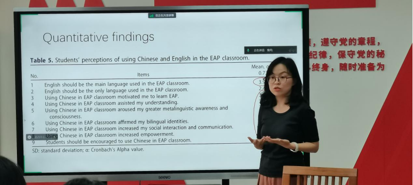 邓谊博士的学术分享选题新颖、逻辑缜密,数据详实,论证深入,是她与研究伙伴的不懈钻研收获的学术成果。与会教师对于教研领域的学术研究表现出极大的兴趣,对于日常教学有了更深刻的理论认识。