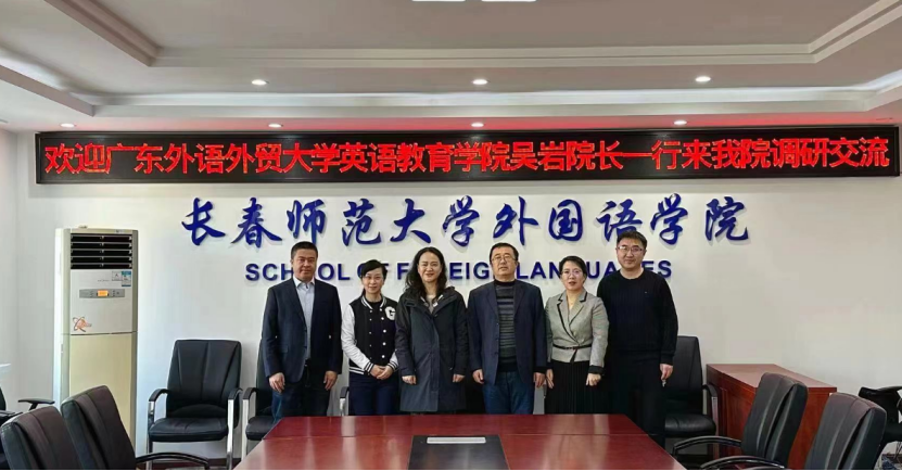 次日,吴岩和李惠胤来到长春师范大学外国语学院开展调研。长春师范大学外国语学院的李书记、苗宁副院长、焦旸副院长及高维亮副院长参与本次活动。会上,苗宁介绍了长春师范大学外国语学院的发展历史及建设成果;焦旸分享了研究生及国际交流工作;高维亮讲解了大学英语教学方面的改革工作。我院吴岩对该学院的师范人才的培养及小语种建设给予肯定。