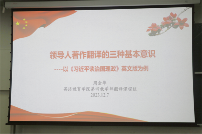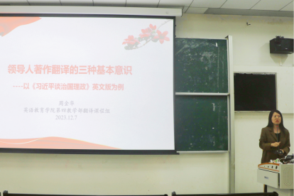 为提高英语师范生的翻译水平和专业素养,12月7日下午,英语教育学院举办“三进”专题讲座活动。第四教学部周金华老师以“领导人著作翻译的三种基本意识——以《习近平谈治国理政》英语版为例”为主题开展讲座,英语师范系2022级学生参与本次讲座。