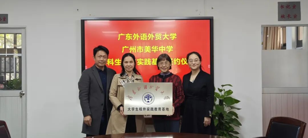 首先,广州市美华中学校长易超对学校的基本情况进行了介绍。她强调了美华中学的教育理念、教学质量以及近年来取得的成果并一同观看了美华中学建校百年的宣传片。随后,英语教育学院党委书记骆银花介绍了该学院的人才培养情况。她详细阐述了学院发展历史、学科建设情况、课程设置、教学特色以及学生实践活动,充分展现了广外英语教育学院的专业实力和学生培养能力。活动最后,双方代表签署了合作协议,并由广东外语外贸大学授予广州市美华中学“本科生校外教育实践基地”牌匾。