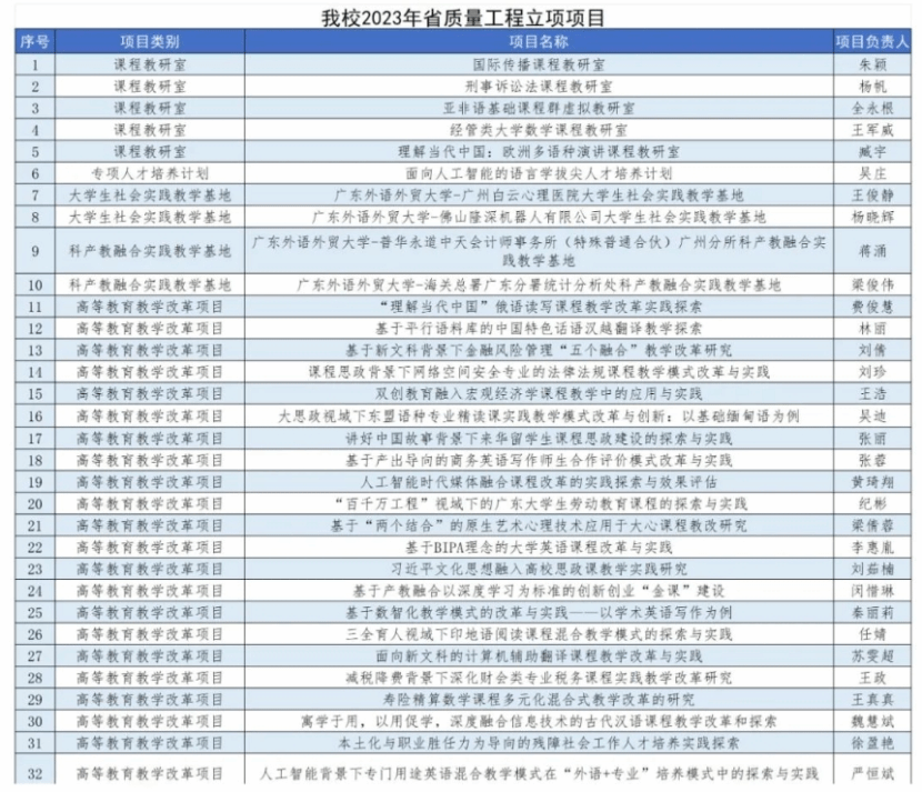 近日,广东省教育厅公布了2023年广东省本科高校教学质量与教学改革工程建设项目(简称“质量”)立项名单。我院李惠胤教授的《基于BIPA理念的大学英语改革与实践》、秦丽莉教授的《基于数智化教学模式的改革与实践——以学术英语写作为例》荣获2023年广东省本科高校教学质量与教学改革工程建设项目。