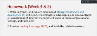 在研讨会的第一阶段,周艳琼老师分享了她主讲的Unit7 Management styles的备课思路。她的教学设计围绕本单元的三个教学目标展开,即影响管理风格的因素、各种管理风格的利弊以及正确理解女性在管理中的角色。为实现本单元的教学目标,除了课本已提供的知识和练习外,周艳琼老师还补充了相关的专业知识点,如management 和management style 的概念、各种管理风格优缺点以及影响管理风格的因素等。这些额外的知识点有助于学生更好地理解本单元的主题,并在话题讨论环节带领学生展开更深入的思考。在课程思政设计环节,周老师引入了中国传统文化中关于管理的名家名言,如“无为而治,则无不治也”(《道德经》)和“将者,智、信、仁、勇、严也”(《孙子兵法》计篇)等,让学生了解和学习我国传统文化中的管理哲学与智慧,从而增强文化自信。最后,在讲解reading 1的备课思路时,周老师特别强调培养学生思辨能力,引导学生思考女性管理者与男性管理者之间的异同。
