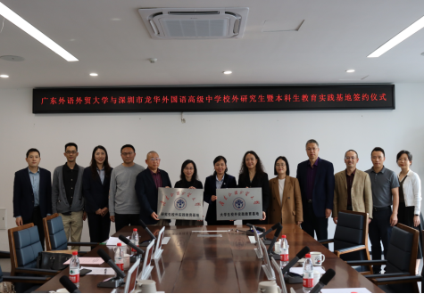 3月20日,广东外语外贸大学英语教育学院与深圳市龙华外国语高级中学举行教育实践基地签约仪式。此次合作覆盖全院本科及研究生阶段学生的实习和见习需求。在签约仪式上,龙华外国语高级中学校党委书记王宏莉首先详尽介绍了该校作为深圳市“十四五”教育规划重点建设项目的特色与定位。该学校秉持“中西交融,文理兼长”的办学理念,旨在打造广东省一流外国语学校的崭新标杆,着力培养具有外语特长、鲜明特色、多元文化视野、国际观照、科学人文素养,兼具“中国心灵、世界眼光”的高素质复合型预备人才。学校开设多种小语种课程,并率先开设日语高考班;聘用资深外籍教师,为学生提供针对性的地道口语训练,另选拔欧美海归硕士,与外教配合教学;与美国、英国、西班牙、日本等国家的高等学府和知名中学进行国际课程合作,定期进行学术交流,为学生的进一步深造拓展通道。