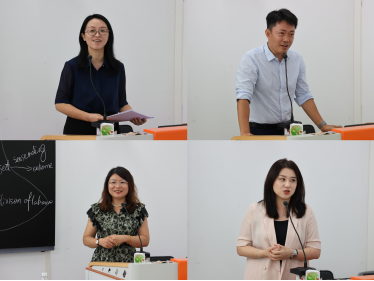 曾丹副教授介绍了基于涉外法治人才培养需求的《学术英语》课程思政教学改革,以及如何通过开展嵌入式教学、综合设定学术技能,培养学生的学术意识、素养和科学精神,为法律英语及全英专业课程打好基础;刘亮星教授以市场营销英语课程为例探讨了课程思政的创新实践,展示了如何将专门用途英语教学与社会主义核心价值观无缝对接,实现知识、能力与价值观的多重培养;陈媛媛副教授分析了教材中的文化对比、价值观探讨等思政资源,并通过具体教学案例展示如何将思政内容与语言技能结合,提高学生的英语能力、文化自信、社会责任感和民族自豪感;范栩颖博士探讨了如何通过创新的教学设计和多样化的教学方法将思政教育融入大学英语教学,描绘了在知识、技能和价值观等方面探索学生与教师共同成长和蜕变的新路径。