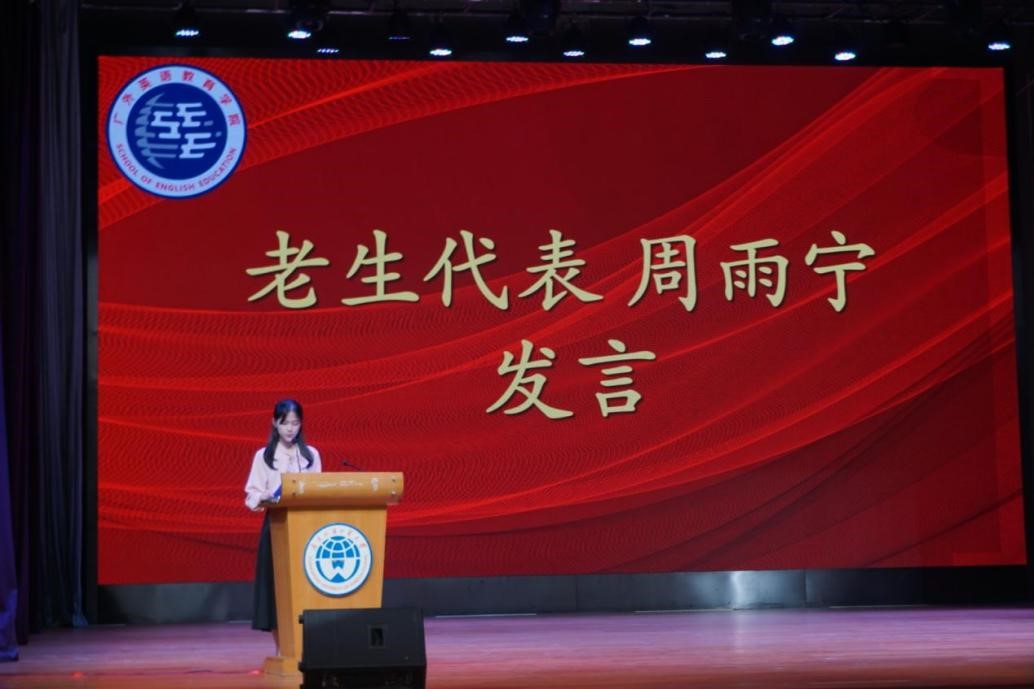 优秀校友代表陈若浩从自身经历出发,分享了他从广外到哥伦比亚大学的故事。他引用“人生是一场马拉松”,鼓励新生“Dreams are made for those who really try”,并希望每位新生将校训“明德尚行,学贯中西”内化于心,外化于行,成为一名优秀的广外人。