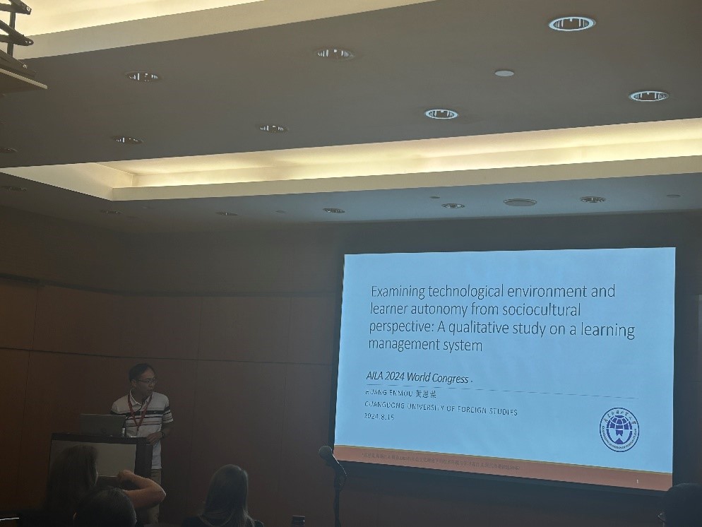 黄恩谋做了题为“Examining technological environment and learner autonomy from sociocultural perspective”的报告。本报告汇报了黄恩谋与合作作者们做的一个探讨非英语专业学生使用某课程管理系统过程中的自主学习行为及其影响因素的研究。他指出,尽管学习者表现出多维度的自主性,但是囿于工具性动机,这些自主体现为外显的、反应性的低层次自主。他明确,学习者自主存在于师生互动和人机互动的社会文化环境中,各影响因素达成协同效应方能促进自主。教师需设计合理的学习任务或项目,关注学习者个体特征,并营造社会化学习环境,才能更好地引导学习者往高层次自主发展。
