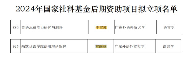 12月17日,全国哲学社会科学工作办公室公布了2024年国家社会科学基金后期资助暨优秀博士学位论文出版、优秀学术著作再版项目立项名单。英语教育学院李雪莲、宫丽丽两位老师获得2024年国家社会科学基金后期资助项目立项。