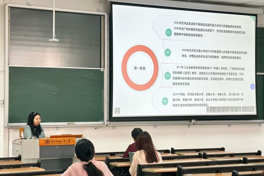7日上午,学院邀请天河智慧城第一小学校长于芳开展了题为《小学英语拼读教学校本课程的开发与实践》的学术讲座。于芳针对小学英语语音教学开展的目的、要求及现存问题,详细阐述了小学英语拼读教学校本课程开发的五个阶段。此外,她还分享了其团队项目的开发成果,鼓励同学们在今后的教学过程中基于学生的实际情况,有针对性的设计课程内容,并合理借助现代教学工具,激发学生的学习兴趣。