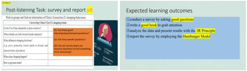 张忆老师采用了传统英语专业训练听力的Dictation文本听写模式,帮助学生们提升精听能力,学生反馈:听力提升效果显著。马小宇老师强调了线上线下混合教学模式的优势,运用翻转课堂,让学生们先线上学习部分内容,再由老师在课堂上深入探讨和总结点睛,深受学生们的好评。