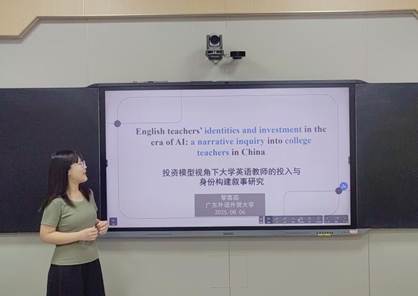 黎嘉茹同学聚焦于“数智时代语言教师的专业发展”这一论坛主题。围绕投资模型视角下大学英语老师的身份构建这一具体内容进行展开,向在场老师和同学介绍了相关的研究背景、意义与设想等。获得了在场研究者的一致肯定。