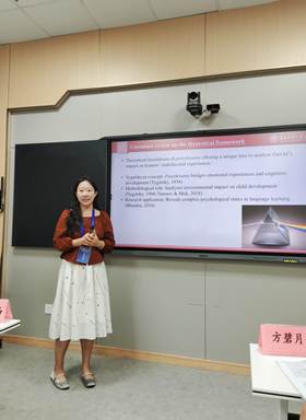 董京京同学的发言从社会文化理论视角出发,围绕英语作为二语的学习者在续写修改任务中的情感体验与修改行为展开,她融合了生成式AI的调节作用、情感体验的理论视角、Q方法这种研究方法,与现场老师同学们开展了分享与讨论。