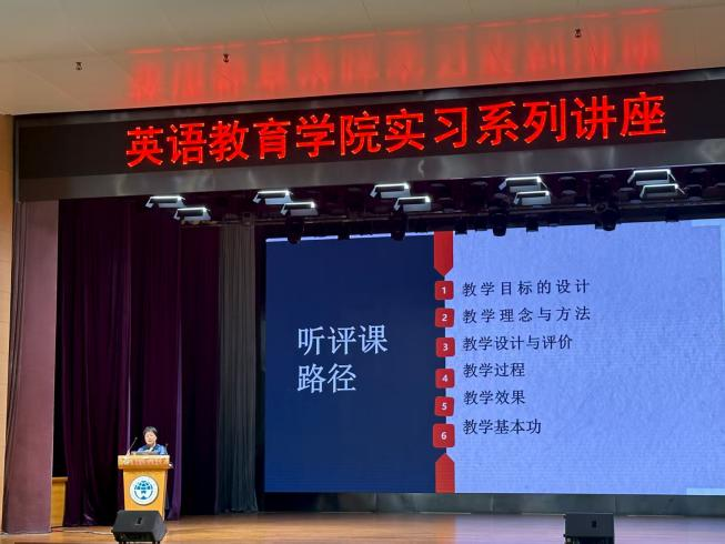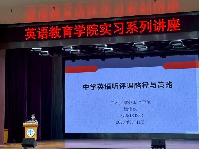 2025年9月11日上午9时至11时,英语教育学院实习系列讲座第四场在B8学术报告厅顺利举行。我院特邀广州大学外国语学院徐俊仪,开展中学英语听评课路径与策略指导讲座。英语教育学院教育全体2022级本科生参会,讲座由英语教育学院实践教学部主任刘之远主持。