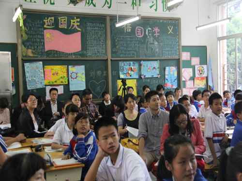 此次活动和会议选择在景中实验中学召开,既是对教育系实习生实习情况的考察和成果的验收,也是对我院合作伙伴原赤岗中学变更校名后的实地参观交流。在景中实验中学刘竞贤副书记的带领下,参加活动的老师们首先参观了校园。自学校改名后,为了彰现办学特色,操场增加了“国学广场”、“科学角”、“蓝色海洋”等内容。随后,一行人步入了初一(6)班的英语课堂,聆听我系实习生陈紫晴同学的授课实践。这是一堂成功的“汇报演出”:实习教师驾轻就熟,从容镇定,上课节奏紧凑、一气呵成,教学辅助工具操作熟练,神态自信大方、语气坚定,与学生互动紧密而高效,可见实习生在我系三年的学习和实践的基础之上,教学实操能力在该校又进一步得到了提升。