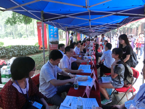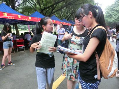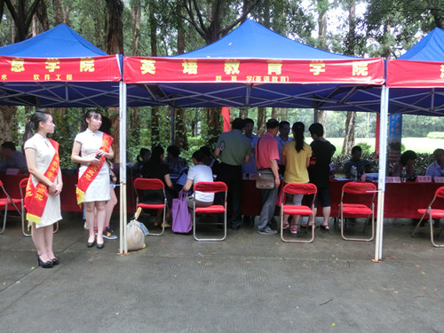 上午9:00时摊位及展板在学院老师和志愿者的共同努力下很快便布置好了,现场人山人海,非常热闹。虽然天气很热,但仍然没法阻挡过往家长、学生要了解广外各学院招生相关要求、专业设置等的决心。英教志愿者们一齐穿着印有“英教团学”的团服,或穿梭,或等待在人群中,耐心地发出一张张传单,传递着一颗颗“英教欢迎您”“欢迎前来英教摊位咨询”的真心,在闷热的天气里滴下一滴滴汗,但仍不忘为家长、学生们介绍讲解,对不是很了解的问题便及时地带领其到摊位前由学院领导老师进行更专业的讲解。领导和老师对前来咨询的每位学生、家长也非常认真细致地讲解,家长们比较关心的内容主要是院内专业课程设置、本科招生录取分数线、本科招生要求、国际合作项目、交换生项目、毕业生去向、学校住宿条件等等,领导老师们纷纷对其进行详细的介绍和解答。多元化的课程,多向的毕业生去向,丰富的学院活动……在听完英教专业的相关讲解后,家长学生们纷纷面带着笑容表示感谢而后离开摊位。咨询者的满意笑容在这大热天里对现场的工作人员来说无疑是最欣慰的了。