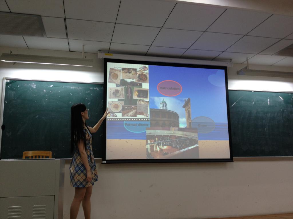 首先,刘芳彤师姐用一口流利的英文简单介绍了分享会的流程,尽管师姐在牛津待了大半年的时间,但并没有十分明显的英式英语口音,她谈到,在去牛津前,自己有苦练两年的英音,但在留学以后,她改变了一些看法,最起码对她而言,现阶段毋需过于注重表达的形式,她更看重的是意义,强调了英语表达的流畅性。