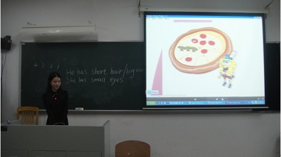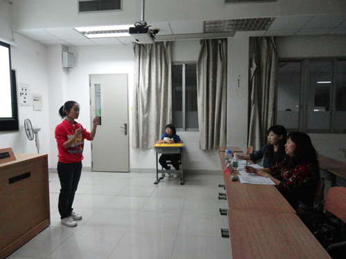来自1001班的曾秀华同学教授的课程是“四季”,一开始以活泼的舞蹈引入课程,调动课堂气氛,她全程运用流利的英文上课,可见其做了充分准备。来自1102班的陈丹同学全程保持笑容,并结合自制的挂钟上了一堂关于“时间”的英文课。在现场我们特别注意到了一位文静亲切的女孩,她是来自行政管理专业大三的曾晓冬。她的课程是关于物体位置、方向的内容,而她的特别之处在于运用了prezi详细清晰地解释各种位置的英文表达方式,而在评委老师点评时也特别称赞了她对于prezi的新颖的运用。在赛后的采访中,我们了解到因为喜欢教学,曾同学去年也有参加MT比赛,她认为MT比赛锻炼人,自己也能从比赛中学到一定的专业教学技巧。“希望下一年还能参加,假期也会争取实习机会”曾同学说道。