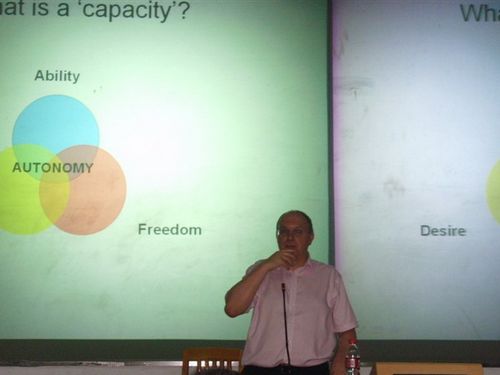 Prof. Philip认为自主是一种控制自己学习的能力。他用两个几何图形生动解释了这种能力。他认为,“自主”是学习能力、学习欲望和学习自由三种能力的交集。对于这一点,教授用学开车做比喻,形象地说明了学习欲望的重要性。其次,这种控制也是由三部分组成,分别是学习管理,认知过程,和学习内容。为了更加通俗易懂,教授举了一个例子,即制作学习计划,学习时集中注意力,和选择什么样的学习内容。接着他指出目前对自主有三种不同的看法,即是思想上的,心理上的和经济上的。思想角度认为个体有自己决定学习内容的权利,心理上则认为学习是更有意义的,永恒的,从经济的角度看社会没有足够的资源给每个学生。之后他还提到了学生在具备或不具备这种自主能力的情况下如何教学等。