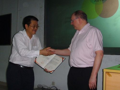 教授的讲座有一个特别之处,就是在演讲到一半的时候设置一个小的问答环节。同学们和老师的参与热情很高,教授也详细具体地回答了同学们和老师的问题。问答环节后,周富强院长为Benson教授颁发了我院的正式聘请书和镶有孔子全身像的纪念品并合照留念,这表示他正式受邀成为我院长期客座教授。