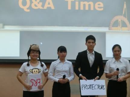 比赛正式开始。每个队伍在开始展示之前,都会先播放亲友团小视频。在一分钟的小视屏里可以感受到每支队伍整个团队、整个班级的努力,视频传递出班级里同学们满满的友爱以及支持。每个队伍的展示的主题不一,有的队伍讨论的是对gender difference的看法,有的是针对marriage value,有的是关于当前世界热点global warming……队伍们的展示方式也很多样化,例如模拟法庭、采访、简单的阐述以及模拟场景对话等方式。每个小组展示时间为12分钟,在展示环节过后,还有约两分钟的中外评委提问,评委老师提出问题,学生们在规定的时间内回答问题。此次比赛中每支队伍都将比赛前的充分准备在舞台上尽情地展示,比赛精彩激烈,真是“台上一分钟,台下十年功”!。