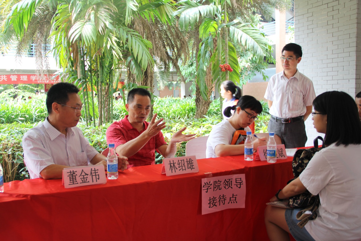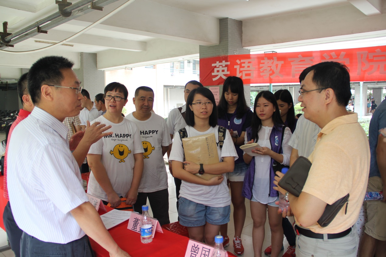 星期日,广东外语外贸大学英语教育学院迎来了朝气蓬勃的2015级新生。本次英教新生的报到点位于南校区南苑8栋架空层,出席迎新接待处的领导嘉宾有英语教育学院院长董金伟、党委书记林绍雄、党委副书记徐昶斌、办公室主任曾国华、辅导员迟殿凤和林泽龙。