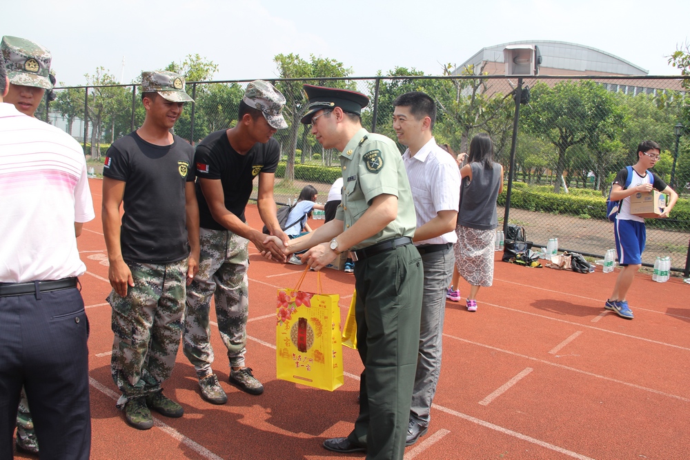临近中秋佳节,林绍雄、熊涛和徐昶斌代表英语教育学院向四位教官发放月饼礼盒以示感谢并予以节日慰问,各班班导也给每位同学派发了功能性饮料,为新生们带来了一丝清凉。