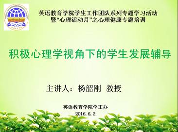 2016年6月2日,我院开展英语教育学院学生工作团队系列专题学习活动暨“心理活动月”之心理健康专题培训,特邀我校政管学院教授、博士生导师杨韶刚带来“积极心理学视角下的学生发展辅导”的专题讲座。英语教育学院党委书记林绍雄、党委副书记徐昶斌,辅导员迟殿凤、林泽龙,以及学院各年级心理委员、宿舍长、2016级新生朋辈导师参加了此次讲座。
