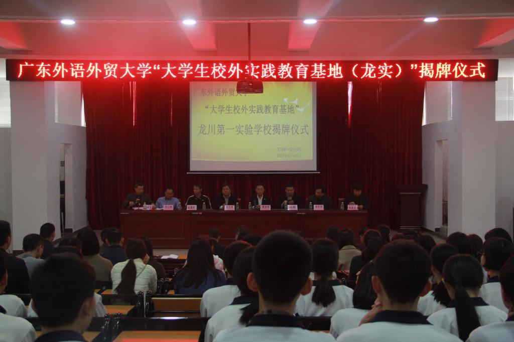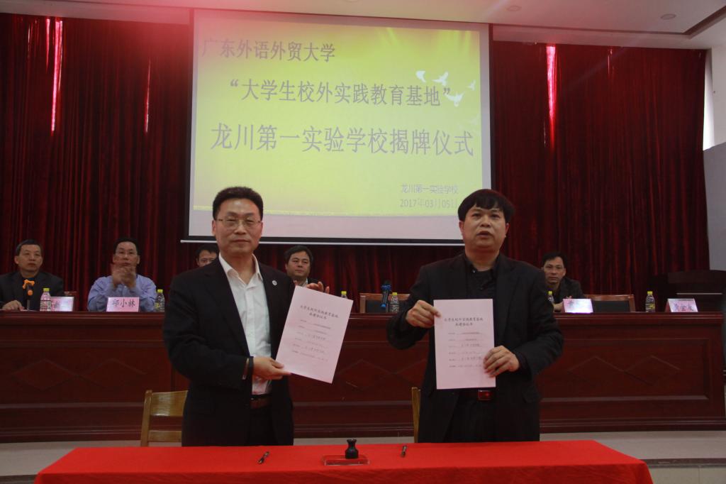 3月5日,我院与龙川第一实验学校(以下简称龙实)举行“共建实践教育基地”签约暨揭牌仪式,龙实成为我院在粤东北部,继梅县东山中学和梅州蕉岭中学之后建立的第三个学生专业实习基地。广东外语外贸大学英语教育学院院长董金伟教授、人事处处长谢文新教授、广外英语教育学院团委书记林泽龙、龙川县老隆镇镇长黄东林、龙川第一实验学校副董事长邱小林、校长黄金友等嘉宾领导出席了仪式。仪式由龙实常务副校长邓新华主持。