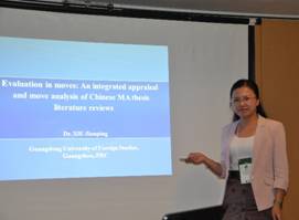 谢剑萍博士在“语篇分析与语用学”(Discourse Analysis and Pragmatics)小组宣读了题为“Evaluation in moves: An integrated appraisal and move analysis ofChinese MA thesis literature reviews”的论文,该论文主要探讨中国学生在英语学术语篇中表达个人评价的特征及存在的问题,会上与来自各国的学者展开了热烈而具成效的讨论,为今后的后续研究拓宽了视野和方向。