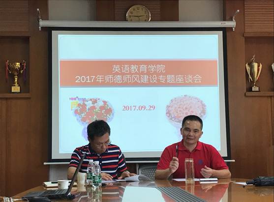 2017年9月29日下午,我院于南院系办公楼245会议室召开了主题为“立德树人,做好学生引路人”的师德师风建设专题座谈会。会议由学院党委书记林绍雄主持,院长董金伟、副院长陈金诗、各系部骨干教师代表及办公室的同志们参加了会议。