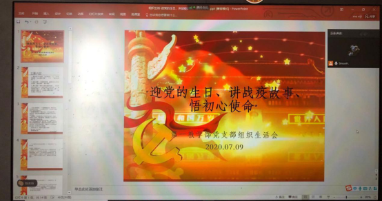 2020年7月9号下午2点至3点半,英语教育学院第一教学部党支部共聚云端,借助腾讯会议为媒介举办了主题为“迎党的生日、讲战疫故事、悟初心使命”的支部组织生活分享交流会。会议旨在欢庆党的第九十九个生日,并借机邀请支部各党员分享身边感人的战疫故事,从而推动大家从思想理论高度重新感悟作为党员的初心和使命。