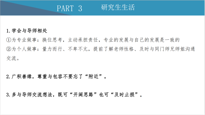 首先发言的是就读于华南师范大学特殊教育学院的叶盎然师姐,分享主题为考研及研究生生活。叶师姐先根据自身经历分别从考前、考中、考后讲述一些实用性很强的注意事项。她鼓励同学们在考场上不要吝啬读题的时间、多写才可能多得分。她还建议积极利用身边的资源,做更充足的准备。除此之外,师姐也对同学们将来的研究生生活提出建议:乐于承担学科建设责任;积极与导师、同学交流等。