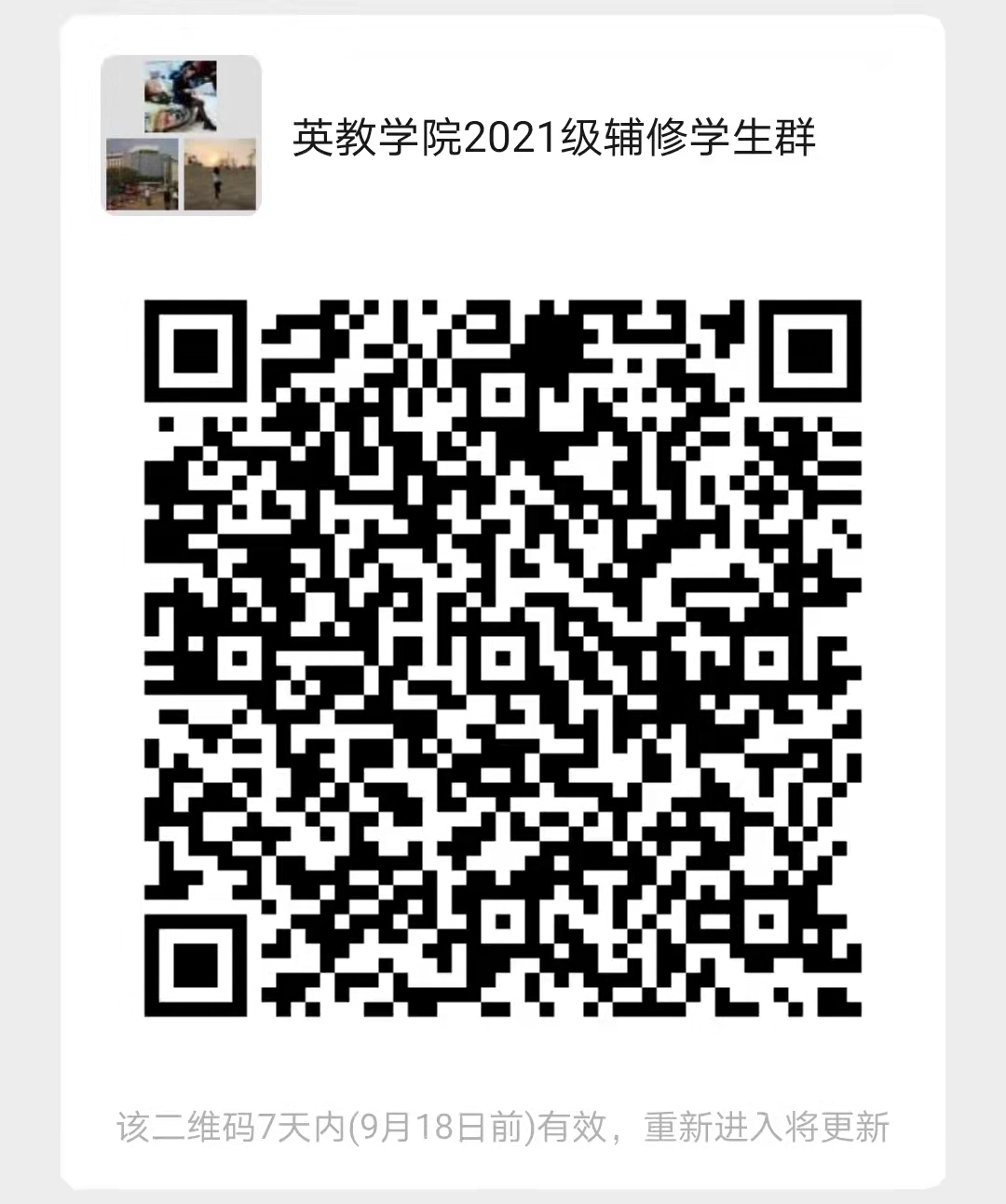 请拟录取同学扫描附件中的二维码加入2021年英语(辅修)专业微信群,后续事宜将通过微信群通知。