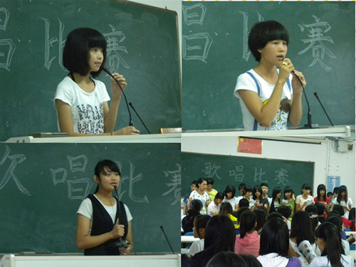 歌唱比赛的选手们对歌唱有强烈的兴趣和热情。看,初一(2)班的全班同学热情款款地演唱了《真的爱你》,悠扬的歌声展现了全班同学互爱互助的风貌;听,来自初二(2)班的邹幸尧和邹晓欣同学合唱的流行歌曲《那些年》再度激起了全场高潮,在场观众听得意犹未尽;瞧,来自初一(3)班的陈滢影的一曲《宁夏》更似乎给竞技火热的现场带来了一丝丝炎夏的凉意,清亮动情的歌声让人倾心……