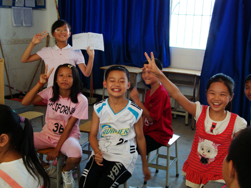 望埠心之望服务队有志于打破英语学习传统。英语学习不用囿于传统的记诵课文、死扣语法的方式,把英语学习融合到游戏中去,不仅可以提高同学们的积极性,还可以培养学生学习英语的兴趣。课桌椅的摆放也不用局限于传统的几大组或是单人单桌的形式,望埠心之望服务队尝试了分组、围圈、甚至是“零课桌”的形式。同学们对于分组讨论,围圈发表自己的意见,或者是对于“零课桌”亲密地坐在一起玩游戏,都感觉既新鲜又特别。