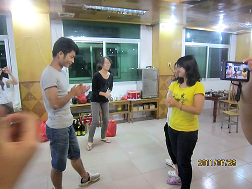 2011年7月26日晚,广外大三下乡清远大湾服务队在大湾中学的教师饭堂举行了激情又温馨的联欢会。三大猛男摇身变成可爱小熊、失传已久的MJ舞表演、搞笑版的天鹅湖男独舞、简单但令人感动的生日会以及刺激无比的真心话大冒险,让大湾队的33位队员在欢笑与紧张中进一步拉近了彼此间的距离。这一大家庭更和谐,更亲密了。