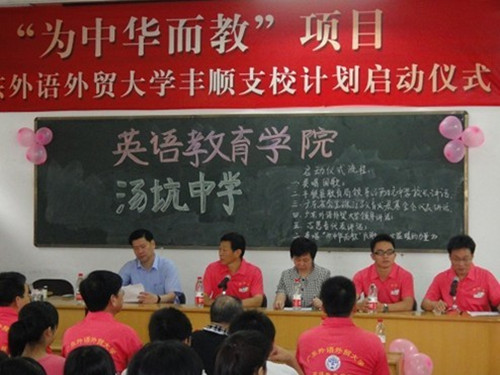 参加仪式的有广外英语教育学院的领导代表以及8位支教老师、合生珠江发展基金会代表、丰顺教育局代表、汤坑中学校方代表、汤坑中学初一初二两个年级共90多名的学生。