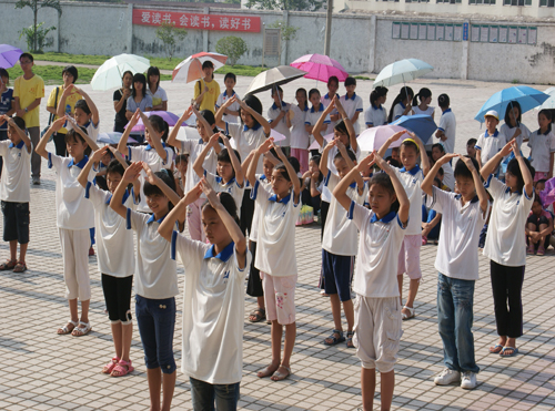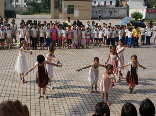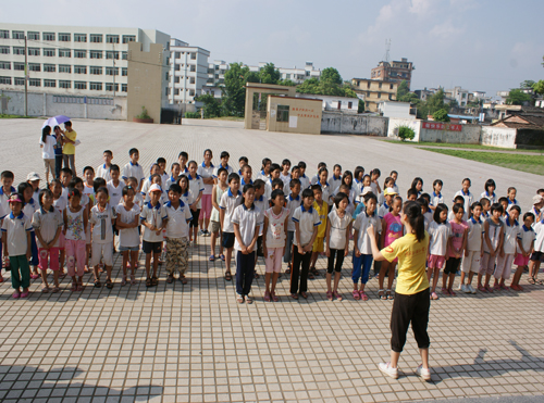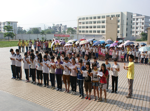 8月2日早上8点30分,清远大湾服务队英语夏令营的闭幕式在清远市英德大湾中学隆重举行。早上7点半,大湾中学、中心小学和小联小学的几百名学生以及32位清远大湾服务队的队员们就早早地到达大湾中学。出席这次闭幕式的领导嘉宾有大湾中学的刘国林主任、中心小学的梁国球主任、广东外语外贸大学三下乡指导老师陈诗金老师。尽管骄阳似火晒得大家大汗淋漓,却晒不灭全场观众对闭幕式的期待。