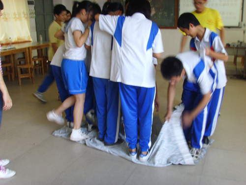 记者来到多媒体2室,这里正在进行翻叶子(窗帘)的游戏。这个游戏看似简单,但是十分考验队伍的智慧和协作精神。其规则是:每队派出八个同学参加,其他同学帮忙出主意。八个同学站在窗帘上,想办法在脚不碰到地的前提下把窗帘翻转到另一面,如果脚碰着地就得重新开始。经过一番认真的对游戏规则的研究和讨论,各支队伍便开始了游戏。在游戏过程中,有的同学比较心急,把窗帘一次就翻了半边,结果八个人都快没地方站了;有的同学险些把脚踩到窗帘外;有的男同学还背起了队友以尽量节省空间;还有些男生还担起了保护女生的责任,围护在四周以避免女生摔倒,场面好不热闹。许多平时腼腆的女生这时都纷纷扯开了嗓门,喊着:“跳啊!跳啊!”男生们则蹲在地上,用力地扯着窗帘。不过,有些聪明的同学找到了窍门:从一个小角开始,慢慢地、一点点地扯。如此一来,他们很快就完成了游戏。