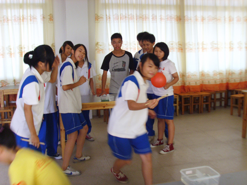 在多媒体6进行的是障碍拍气球游戏,这是一个很考验团队合作能力的游戏,要求学生们分成两个小队,进行接力赛。游戏看似简单,但是,队员们必须要从障碍区里经过,加上还有风扇的干扰,这样游戏不仅增加的难度,还增加了趣味性。同学们很积极,他们在完成的自己的传球之后,还在一旁努力鼓励自己团队的士气。而老师与自己的小助手也是忙得不亦乐乎,特别是小助手们,他们的努力使得游戏井井有条。队伍完成任务之后,都带着满脸的轻松的笑容。