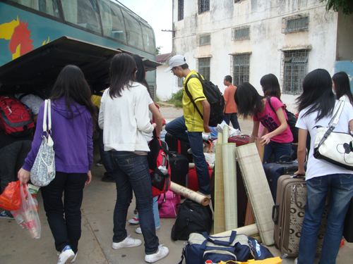 下车停留片刻之后,在当地学生热情的带领之下,我们拎着大包小包,拖着行李箱,浩浩荡荡地向宿舍进发。
