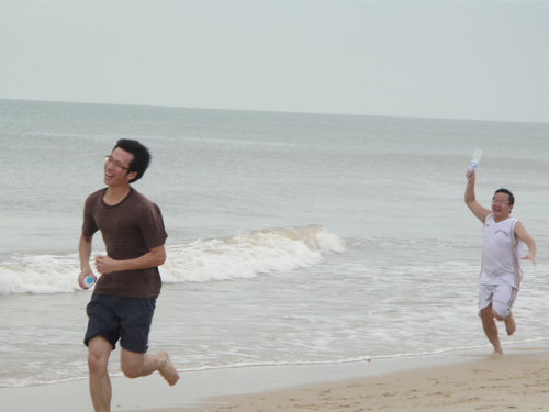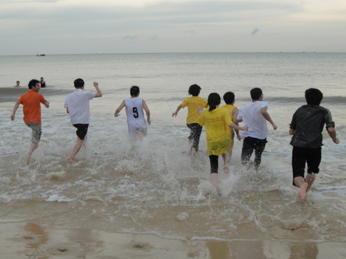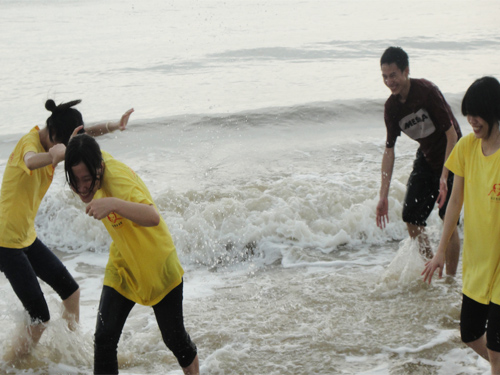 很快,一场沙滩短跑接力赛掀起了这次旅程的又一高潮。我方队员自成一组,而另一组则由当地政府人员组成。随着一声哨响,比赛在热火朝天的加油声中逐渐白热化。由于两方实力相当,大家都暗自捏了一把汗。局势发展总是出人意料,对方队员在第五棒时意外摔倒,上方差距也由此拉开。最后,我方队员在一片尖叫加油声中率先到达终点。但无论结局如何,仍是皆大欢喜,因为最重要的是,在挥洒的汗水和海水之间,我们的距离正在不知不觉地迅速缩小。