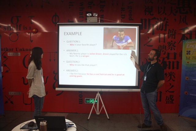 分享会以外籍馆员Sam Boss轻松幽默的问候开场,从美式足球延伸到足球中各类术语中英文对译的介绍;在了解了足球的相关专业术语之后,Sam引导大家如何用合适的英语表达自己对某个球队的喜爱及其原因;最后,Sam邀请现场参与者进行问答,让更多的参与者摆脱腼腆,大胆表达自己的观点。