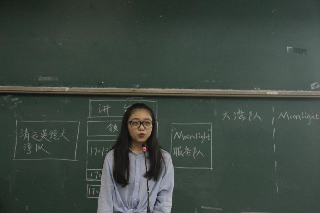 接下来是队伍风采展示时间。率先登场的是清远英德大湾服务队。首先,服务队的队员通过一系列的照片,向同学们介绍了大湾中学基地的概况以及服务队的基本情况。本次大湾服务队的宣传主题为“英趣似莛”,寓意服务队此行寓教于乐,为当地的学生们带去英语的乐趣,使他们勇于发声。接着,服务队的队员向大家介绍了他们此次三下乡活动的文化建设内容以及取得的成果。在这15天里,队员们不仅见证了当地同学们的成长,提高了自身的能力,同时还收获了与当地小朋友的深厚友情。最后,大湾服务队以一曲《天使》结束了他们的介绍,在悠扬的歌声中,我们听到了他们心中对当地同学们的不舍以及诚挚的祝愿。