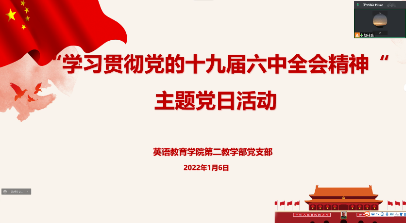 为深入学习贯彻党的十九届六中全会精神,深刻领会《中共中央关于党的百年奋斗重大成就和历史经验的决议》的精髓要义,1月6日,英语教育学院第二教学部党支部通过腾讯会议平台举办了“学习贯彻党的十九届六中全会精神”主题党日活动。支部全体党员同志参加,活动由支部书记赵林森主持。