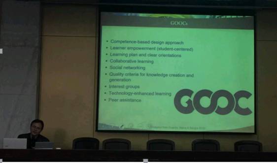 教育部高等学校大外教指委委员、广东省本科大学英语课程教指委主任、广东外语外贸大学副校长刘建达为此次研修班作了第一场精彩主题报告。刘建达围绕“现代技术背景下的大学英语教学改革”这一主题,首先对在线开放课程( Massive Open Online Course MOOC),即慕课的两种基本形式cMOOC和xMOOC做了对比分析:前者强调自学互助模式、侧重知识建构与创造、强调创造、自治和社会网络学习;后者接近于传统教师授课的在线教学模式,侧重知识传播和复制、强调视频、作业和测试等学习方式。刘建达接着结合《大学英语教学指南》要求,从宏观到微观层面阐述了慕课教学给大学英语教学改革带来的前景。刘建达轻松、幽默的报告让教师们对MOOC有了更清晰的理论认识,他提出的“GOOC”概念也获得与会人员的高度认可。
