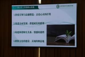 在角色定位部分,张校长指出了班主任的核心价值所在:他们是全能型的角色,承担着班级建设、家校协调等多项职责。她通过生动的例子说明了班主任在价值引领与品德塑造、促进学生全面发展等方面的重要性,并分享了不同类型教师如何发挥自身优势成为一名优秀的班主任。