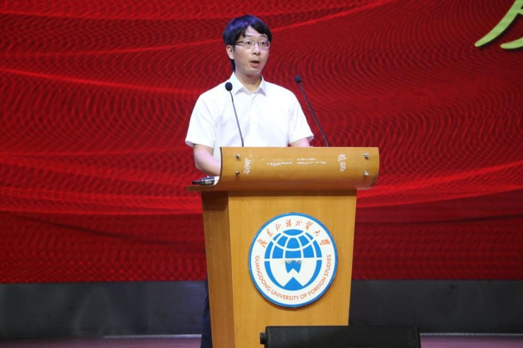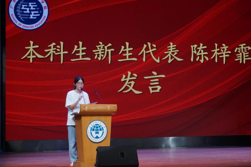 优秀校友代表陈若浩从自身经历出发,分享了他从广外到哥伦比亚大学的故事。他引用“人生是一场马拉松”,鼓励新生“Dreams are made for those who really try”,并希望每位新生将校训“明德尚行,学贯中西”内化于心,外化于行,成为一名优秀的广外人。