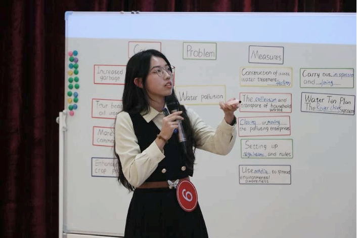 选手谷雨桐使用架构清晰的思维导图层层递进地分析导致水污染的原因,并组织学生开展小组合作讨论可行的解决方案。她通过比较市长、校长、“河长”等不同主体,最终得出“人人都有责任保护水源”的结论。最后,她以多媒体赋能教学,通过播放相关视频来增强课堂教学的感染力,让学生深刻地认识到保护水资源的重要性。