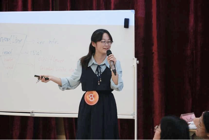经过复赛的激烈角逐,最终有8名选手进入决赛。选手从所给的三篇以“生态文明”为主题的统一难度的文章中抽取一篇,在所配套的英文金句中选择一至两句进行现场微格教学,且微格演示总时间不超过10分钟,最后2分钟是问答环节。选手需针对指定内容进行全英授课以及板书,且所选的金句必须自然融入到文本讲解中。各选手教态自信得体、教学思路清晰、板书简洁、语言表达流畅,充分展现了英教学子极高的专业素养和昂扬的精神风貌。